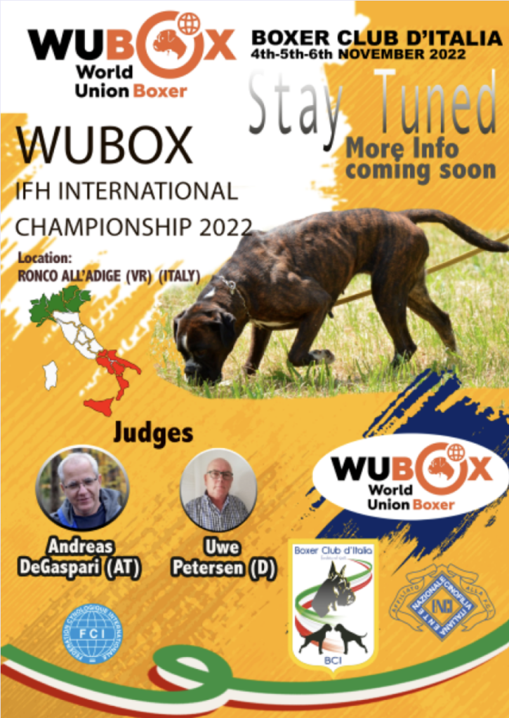 The WUBOX IFH Championship 2022, organized by the Boxer Club D`Italia and hosted by CinoSport Verona, will take place in Ronco ‘all Adige from November 4th to 6th.